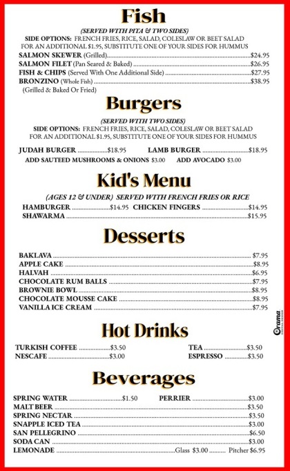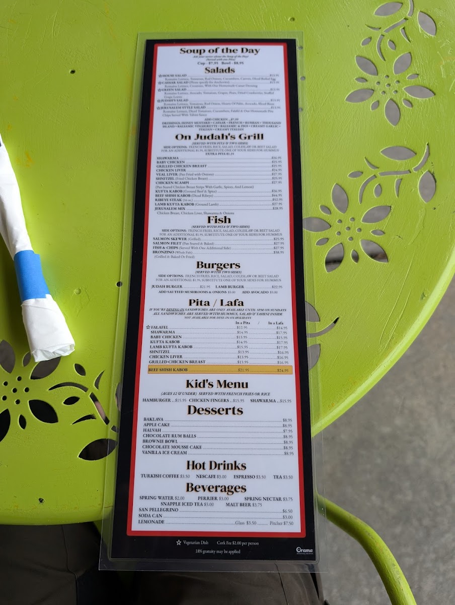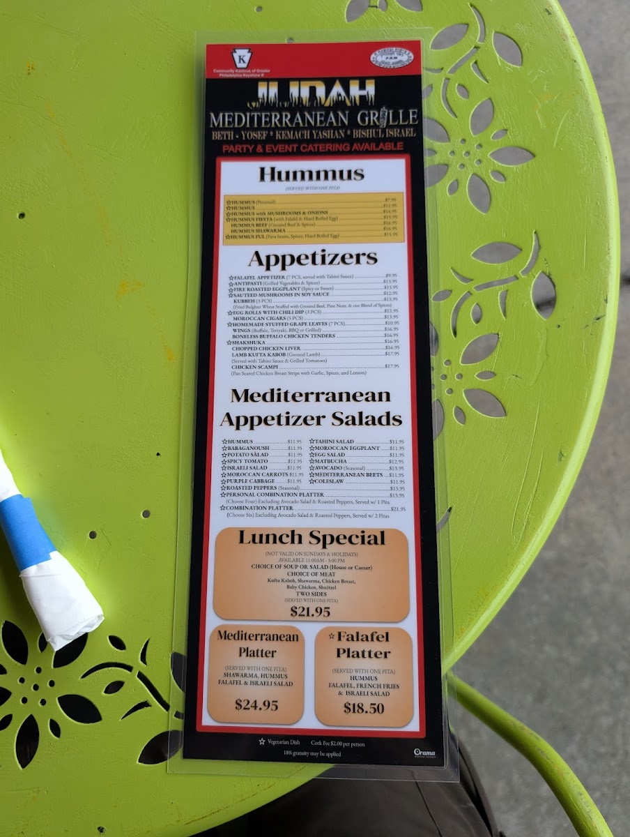 The menu at Judah Mediterranean Grille features a range of kosher Mediterranean and Middle Eastern dishes, suitable for casual dining throughout the day. It is structured into several categories that offer a variety of options for light bites, main courses, and desserts.
