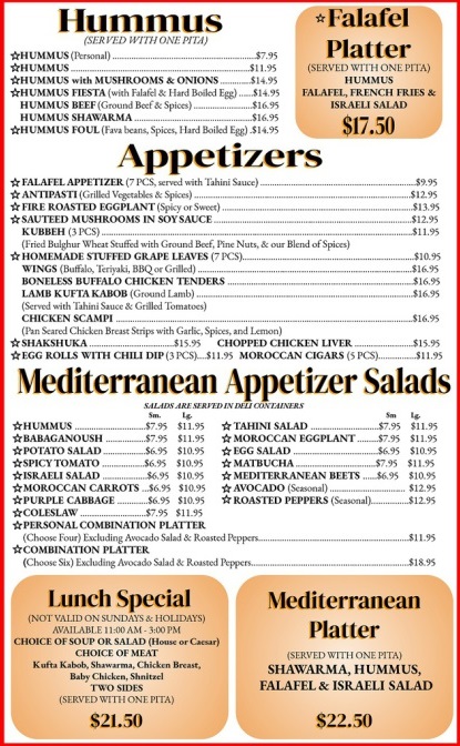 Salads and Appetizers: This section includes a selection of exotic Mediterranean side salads such as hummus, tahini salad, babaganoush, Moroccan eggplant, potato salad, and a range of other vegetable-based dishes. These are ideal for starters or accompanying main dishes.